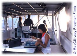 In Dolphins, audiences are introduced to Dr. Kathleen Dudzinski, scientist dedicated to studying dolphin-to-dolphin communication in the wild. Her work often takes her to remote parts of the world where she carries out her methodical research in conditions that are exciting, isolating, and sometimes even dangerous. Though scientists have been observing dolphins in captivity for nearly century, underwater research on dolphins in the wild has only taken place for about 20 years. Dudzinski's research is unique and gives us great insight into the ways that dolphins communicate with each other. Dudzinski's dedication and enthusiasm for her research and the world of dolphins made her a perfect choice as the lead scientist for Dolphins. While attending graduate school at Texas A&M University, Dudzinski traveled to the Bahamas - where swimming with dolphins is still legal - to study the Atlantic spotted dolphins and work as a naturalist aboard tourist boats. Besides gathering data, her job was to make sure that both dolphins and divers had safe, enjoyable encounter. The experience also allowed her to share her research with others. She would return to Texas to study and analyze the data she had collected, then go back to the Bahamas to gather more data. Dudzinski spent four, six-month stints observing dolphins in this fashion for her Ph.D. thesis. From approximately 2,000 hours of fieldwork, she gathered just under 20 hours of usable recordings. Dudzinski overcame a major challenge when she developed and built her first mobile video/acoustic array to record dolphin behavior and communication. Since sound moves faster underwater - 4.5 times faster - the dolphin sounds seemed to come from all directions at once, making them difficult to track. With her professor, Dudzinski devised a simple solution: a pair of underwater microphones, called hydrophones, set on a bar at least 4.5 times wider than the distance between her own ears. The delay produced by that distance allows her to localize the sounds. Later, she studies her films and tapes, and identifies which animal is vocalizing and which are reacting to the vocalizations.